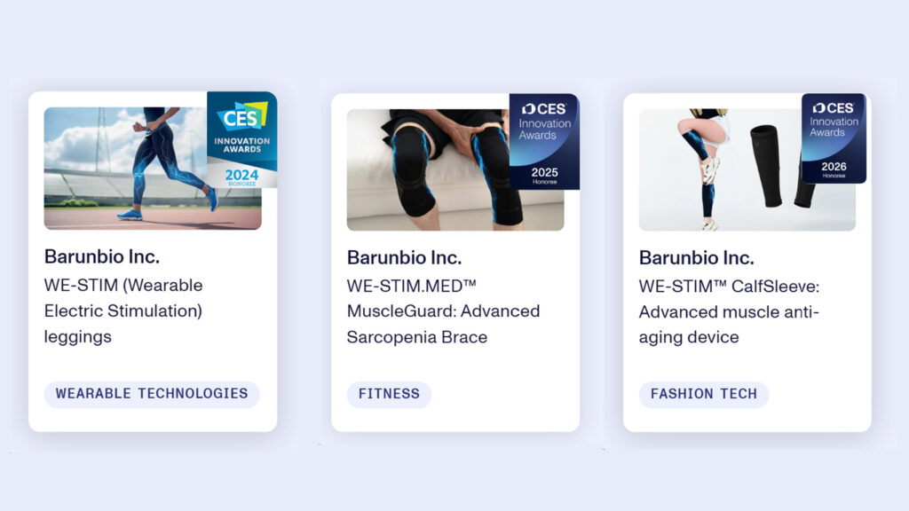 이번 CES 2026에서 혁신상을 수상한 제품은 바른바이오의 독자적인 ‘WE-STIM™ CalfSleeve’입니다.